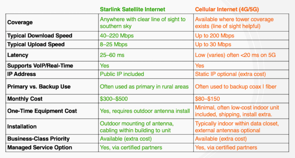 Monthly Plans: $39.99-165/mo. Unlimited vs tiered: Viasat/Starlink unlimited, HughesNet capped.
