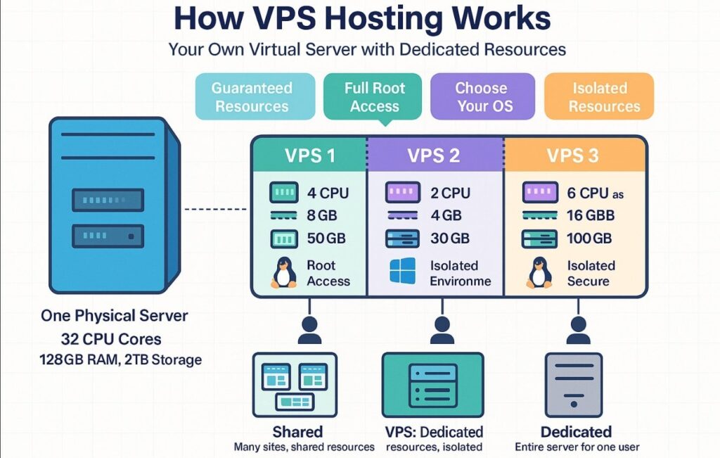 Just think of your website as a cute little house on the internet. A shared house (called shared hosting) is fine when it starts small. But as more friends (visitors) arrive and your house gets larger, you must have your own private space. This is where VPS hosting comes to the rescue—think of it like sharing a big apartment building!